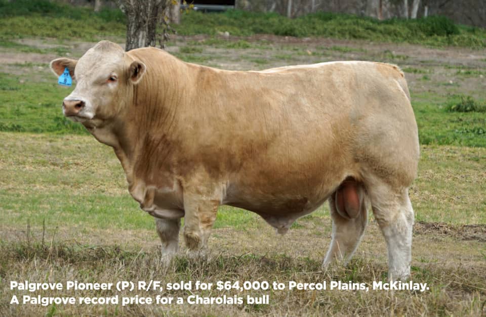 - Charolais Sale Top Price: Lot 8, Palgrove Pioneer (P) R/F, sold for $64,000 (a Palgrove Charolais top price record)