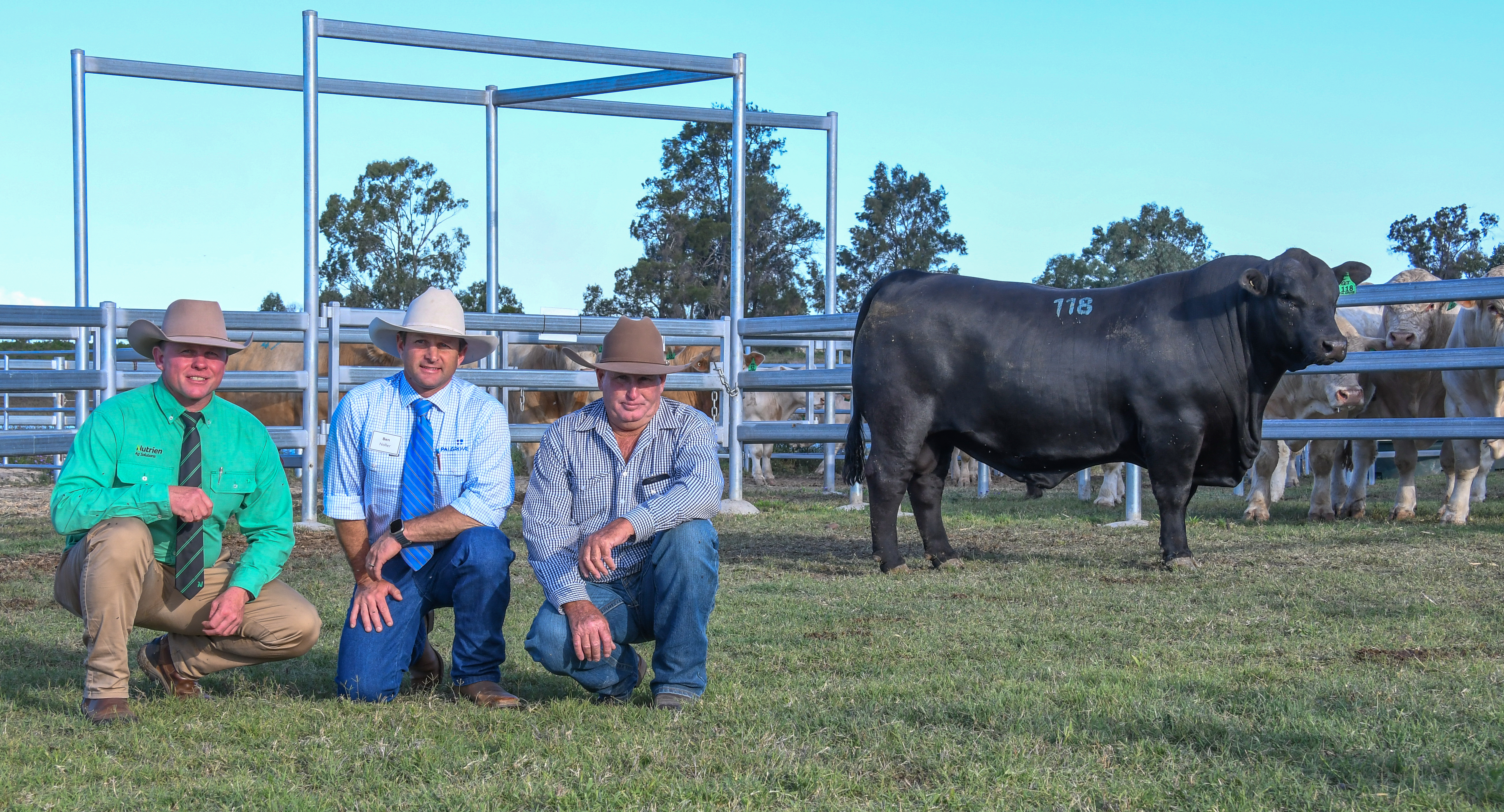 Top Priced Ultrablack buyer Gavin McKenzie, Tannyfoil Brangus with Nutriens Colby Ede and Ben Noller, Palgrove.
