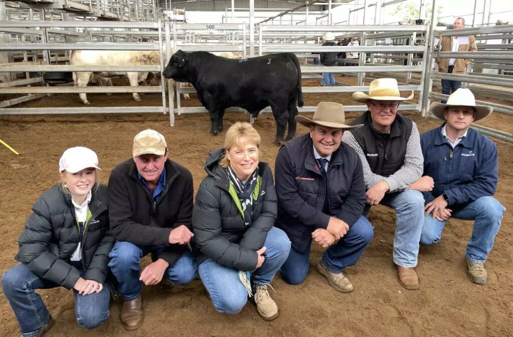 Topping the sale was the last bull in the catalogue, Palgrove Tutor (P), sired by Milwillah Jaal, which Richard, Tracey, and Jess Hulme, Holbrook, bought for $28,000. Tutor is a September 2022 drop calf that weighed 764 kilograms and had an eye muscle area of 126 square centimetres.